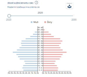 Součástí portálu je i věková pyramida, kterou lze posouvat v čase a sledovat změny v populaci až 10 let dopředu. Kromě toho můžete zobrazit projekce vývoje v různých věkových skupinách – např. pro děti 0–6 let, školáky 7–15 let, dospělou populaci nebo seniory. Grafy pak zobrazují vývoj ve třech možných scénářích při zachování současných podmínek.
