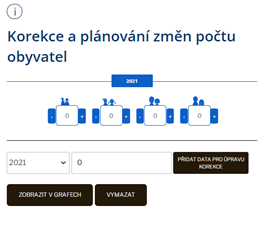 Portál navíc umožňuje vlastní úpravy odhadů. Pokud například víte, že v obci vznikne nová výstavba nebo se chystá větší stěhování, můžete si zadat očekávané změny – ručně nebo pomocí tlačítek – a okamžitě uvidíte, jak to ovlivní budoucí vývoj v jednotlivých věkových skupinách. Výstupy se přepočítají a zobrazí v grafech. Úpravy lze kdykoli zrušit.